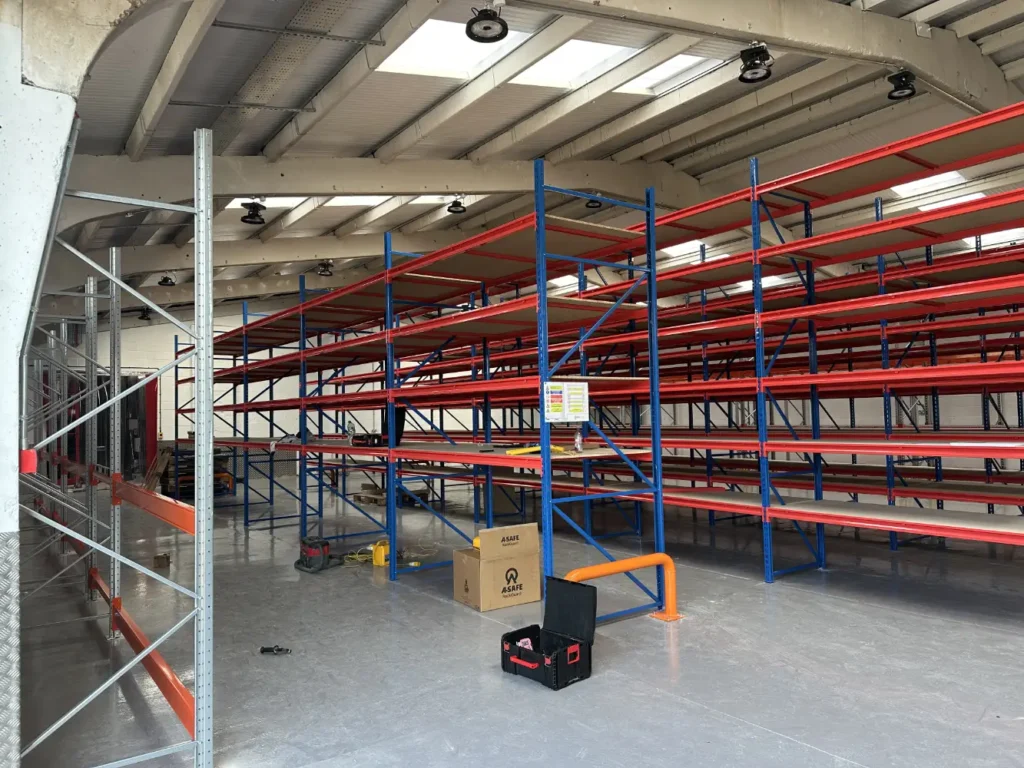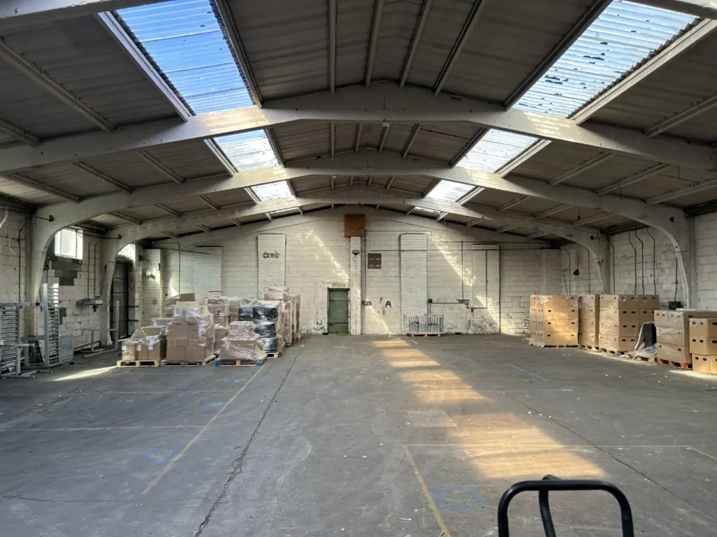 The first phase focused on converting one warehouse into a dedicated goods‑in and quality‑control hub.  The building was stripped back and refitted with modern receiving bays, inspection areas and integrated office spaces.  To connect this facility to the existing HQ, the team designed and built a custom link bridge.  Because the warehouse floors and the office were at different levels, the bridge incorporated a heavy‑duty goods lift.  This ensured materials could flow smoothly into the production and storage areas without manual handling or disruption.