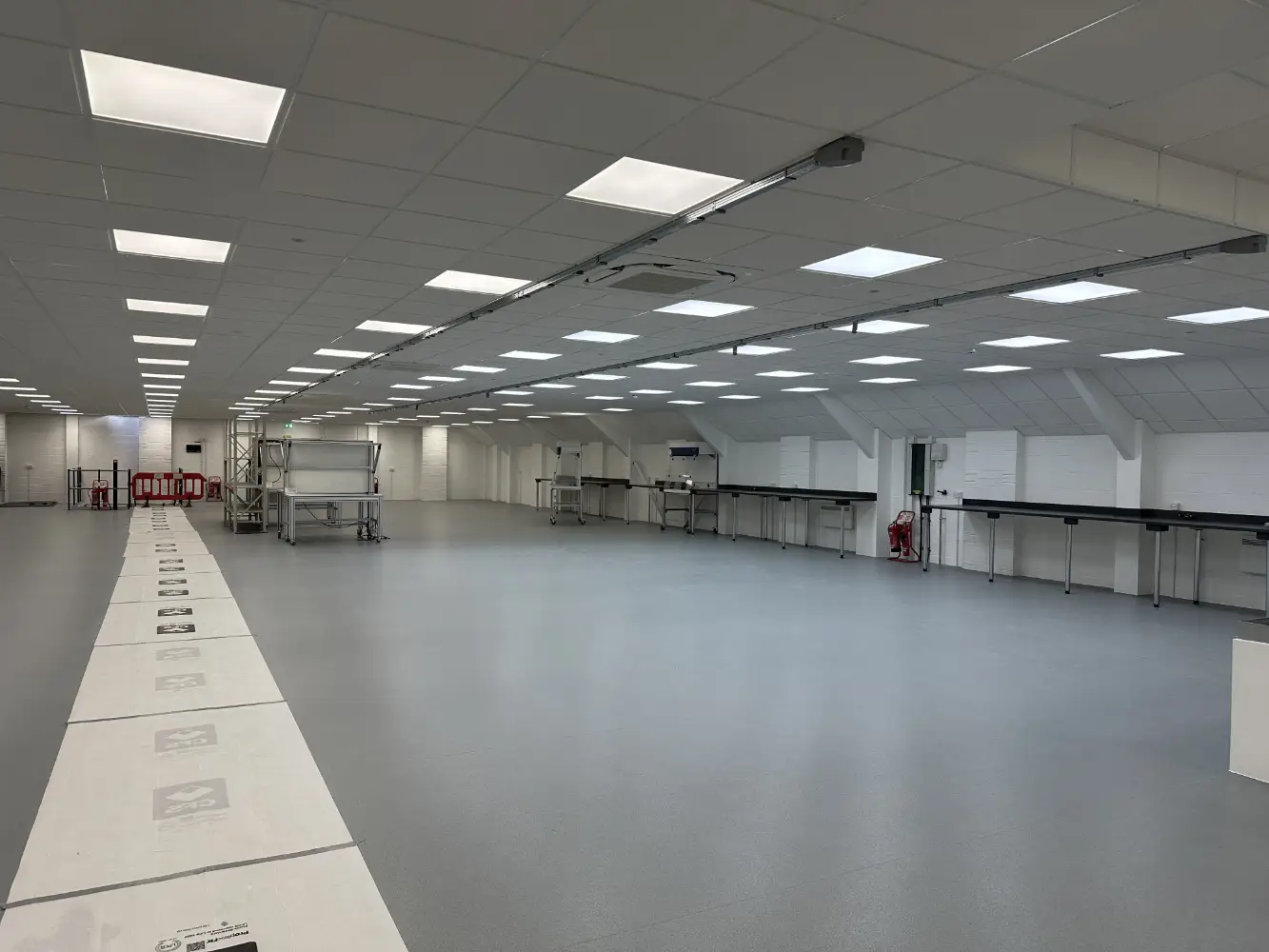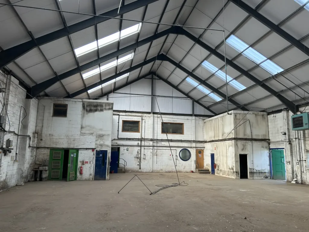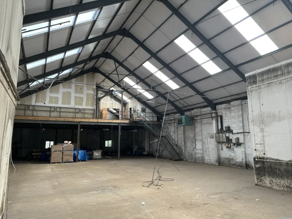 The second warehouse, larger than the first, was transformed into a state‑of‑the‑art manufacturing space.  To maximise footprint, the team introduced a mezzanine floor.  Engineers worked to minimise the number of support columns so that the ground floor remained open and flexible.  New trimming areas and offices were created, and the layout was carefully coordinated to maintain clearances for oversized manufacturing machinery.  The design balanced structural integrity with cost‑effective foundations to support the new mezzanine.